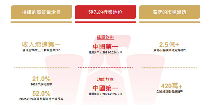 根据弗若斯特沙利文报告,按销量计,东鹏饮料在中国功能饮料市场自2021年起连续4年排名第一,市场份额从2021年的15.0%增长到2024年的26.3%。