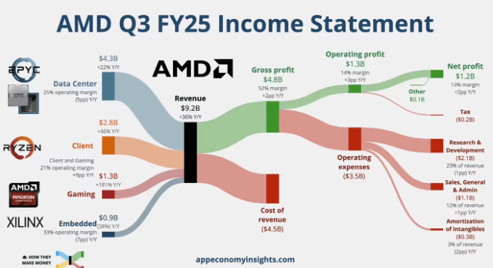 11 月 5 日消息,AMD 昨日(11 月 4 日)公布了 2025 财年第 3 季度(截至 9 月 27 日)财报,公司营收达 92.5 亿美元,同比增长 36%,调整后每股收益为 1.20 美元,双双超出华尔街预期。