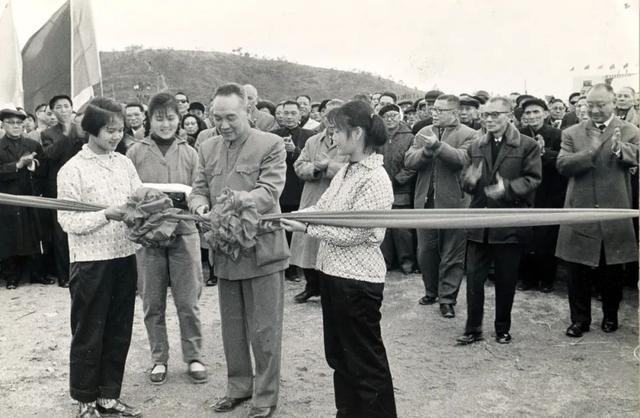 1965年2月27日,广东省副省长林李明在东江—深圳供水首期工程竣工典礼上剪彩。后排右起为香港中华总商会副会长王宽诚、香港工联会会长陈耀材、香港中华总商会会长高卓雄等。