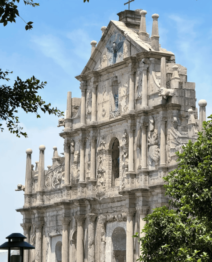 这天一早乘坐穿梭巴士经港珠澳大桥前往澳门,全程约40分钟,大桥如巨龙跨海,工程感十足。抵澳后直奔大三巴牌坊,这座融合了欧洲文艺复兴与东方元素的遗迹,是澳门的象征。接着登上炮台山,视野开阔,还能看到老城区全貌。下午参观金莲花广场和妈祖庙,前者庄重大气,后者香火缭绕,体现了澳门多元文化的交融。