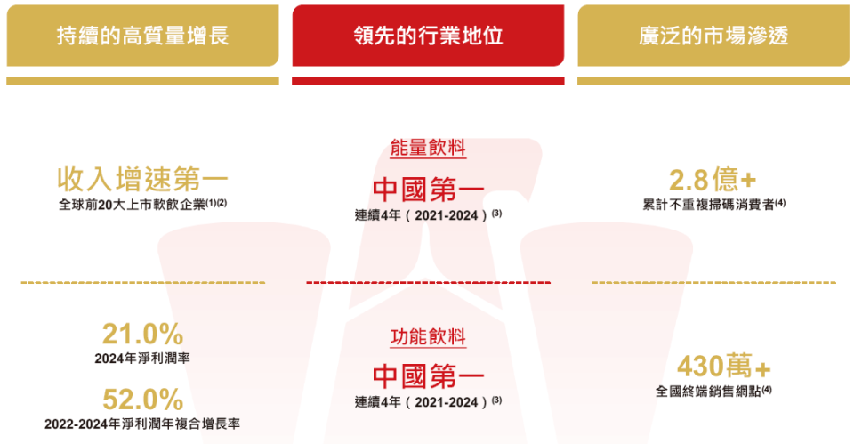 根据弗若斯特沙利文报告,按销量计,东鹏饮料在中国功能饮料市场自2021年起连续4年排名第一,市场份额从2021年的15.0%增长到2024年的26.3%。于2024年按零售额计,东鹏饮料是第二大功能饮料公司,市场份额为23.0%。