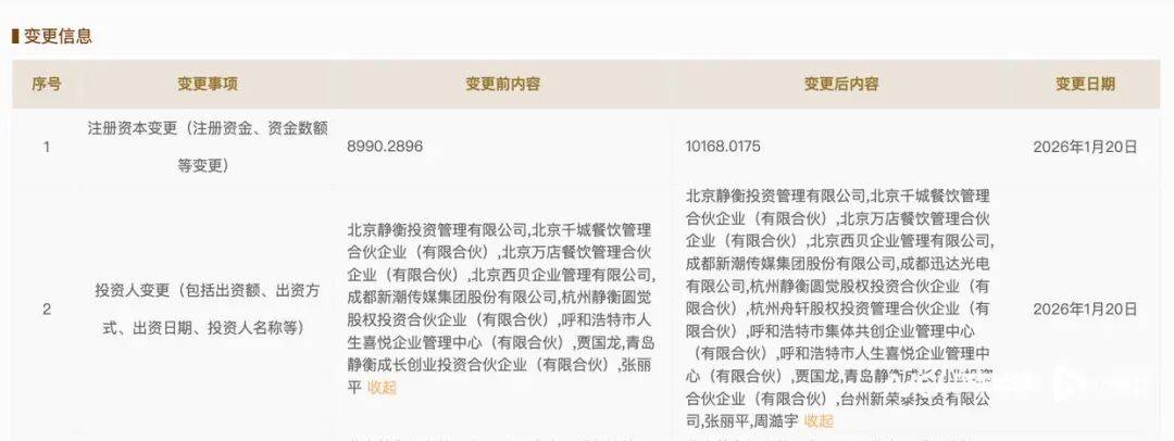 天眼查工商信息显示,近日,内蒙古西贝餐饮集团有限公司发生工商变更,新增台州新荣泰投资有限公司、呼和浩特市集体共创企业管理中心(有限合伙)、杭州舟轩股权投资管理合伙企业(有限合伙)等为股东,同时,注册资本由约8990.3万元增至约1.02亿元,增幅约13%。