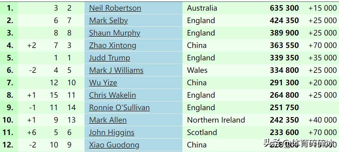 排在前三的仍旧是小特、囧哥以及罗伯逊,他们的总积分都超越了100万英镑。不过,赛季末囧哥将会被扣除掉世锦赛的50万英镑,他的积分将会跌至85.27万英镑。
