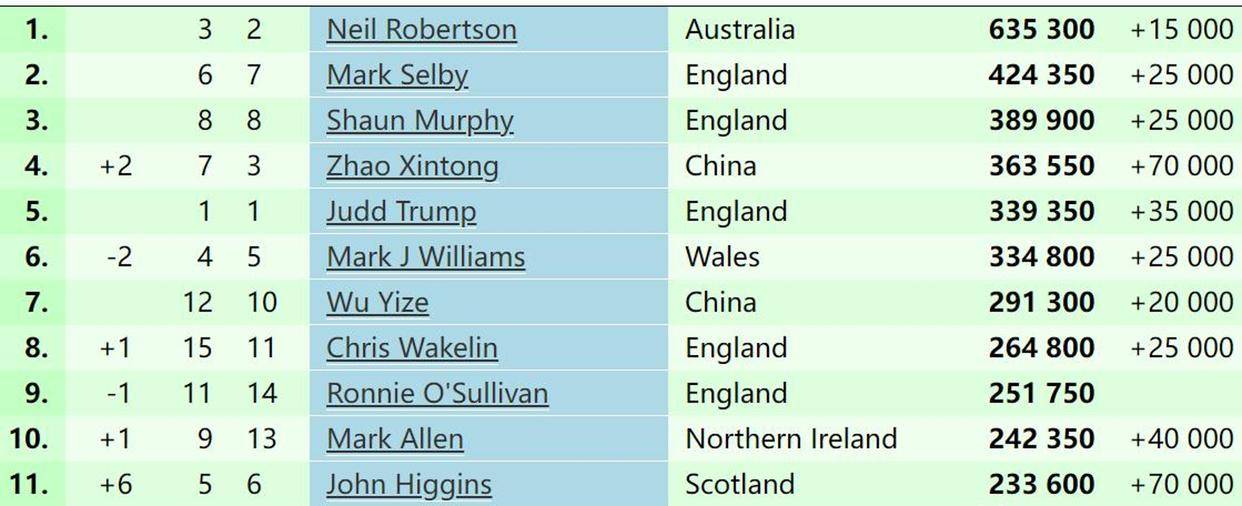 目前世界排名前三还是小特、囧哥和罗伯逊,三个人的积分都超过了100万英镑。不过,到了赛季末,囧哥会被扣除世锦赛的50万英镑,这样他的积分就会掉到85.27万英镑左右。