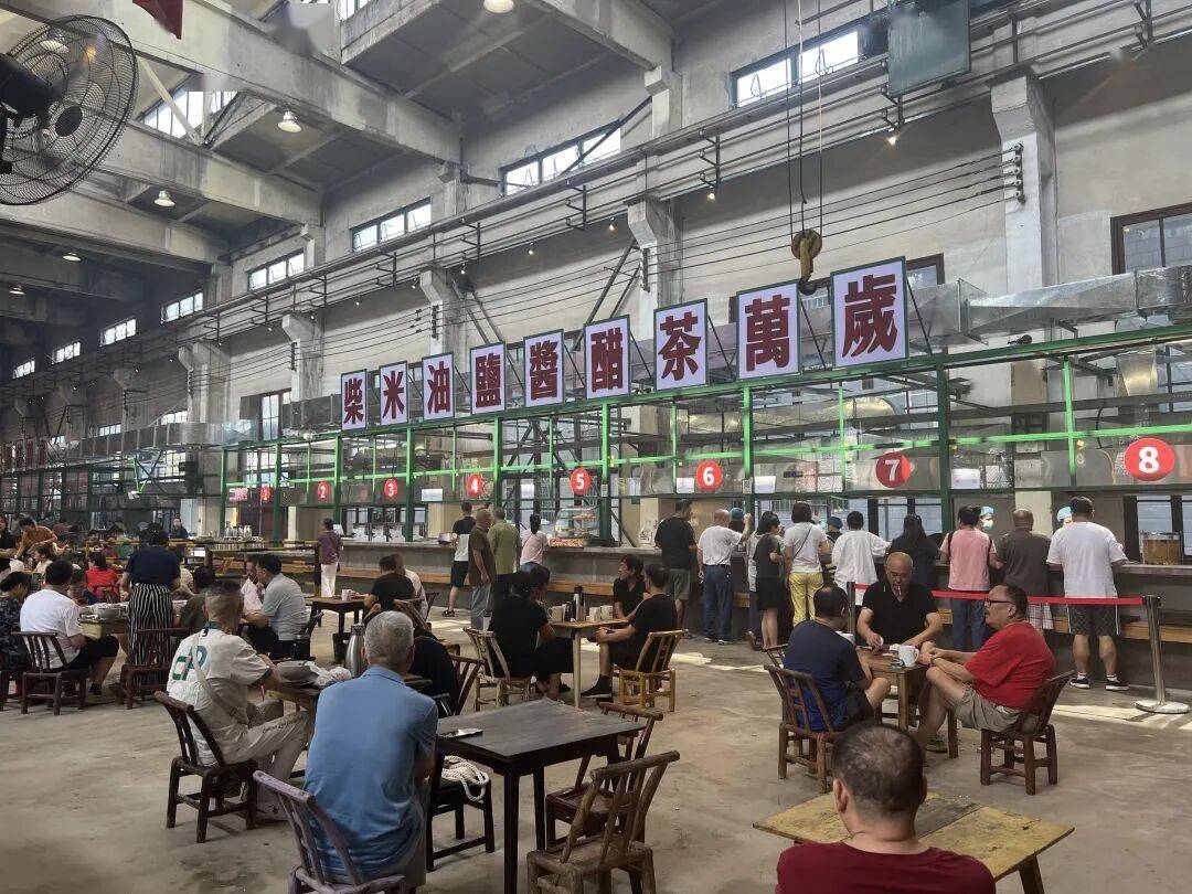 走进曙光茶厂,宽敞的空间,百余张餐桌依次排列,老机械陈列其中,墙上张贴的红色语录和宣传画一下把人拉入怀旧的气氛中。这也让它成为园区内当之无愧的“流量担当”。