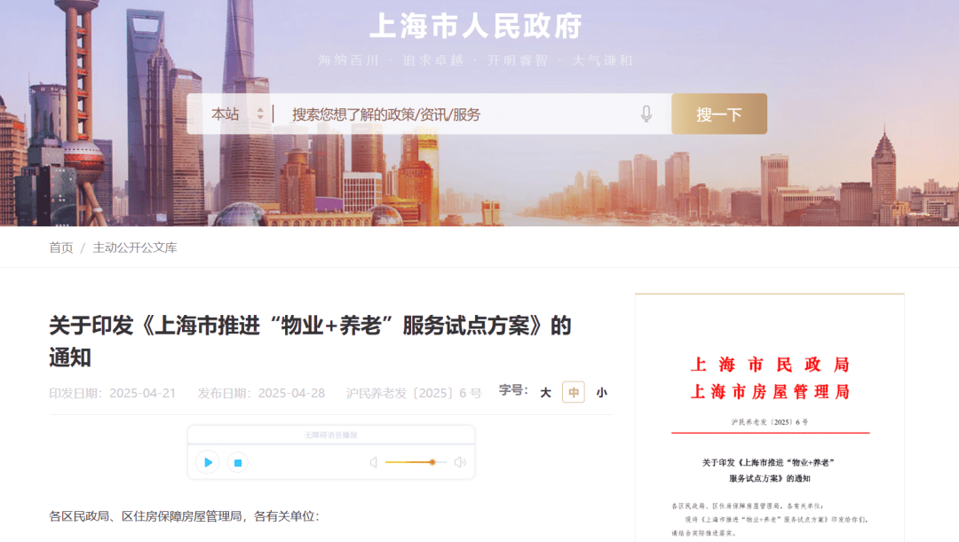上海市作为我国老龄化程度最高、养老服务需求最为迫切的超大型城市,近年来在养老服务体系建设方面进行了一系列创新探索。2025年4月,上海市民政局与上海市房屋管理局联合印发《上海市推进“物业+养老”服务试点方案》(沪民养老发〔2025〕6号),标志着一种全新的养老服务模式正式进入实践阶段。这一政策创新将物业服务企业与养老服务有机结合,旨在充分发挥物业企业常驻社区、贴近居民、响应快速等优势,为老年人提供更加便捷、高效的居家社区养老服务。