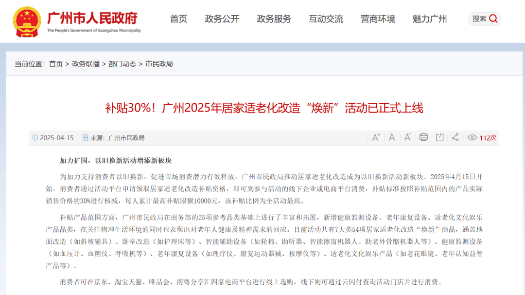 广州2025年居家适老化改造“焕新”活动中,补贴产品目录中就包括智能辅助产品和健康监测设备等,也为服务的开展提供政策支持。