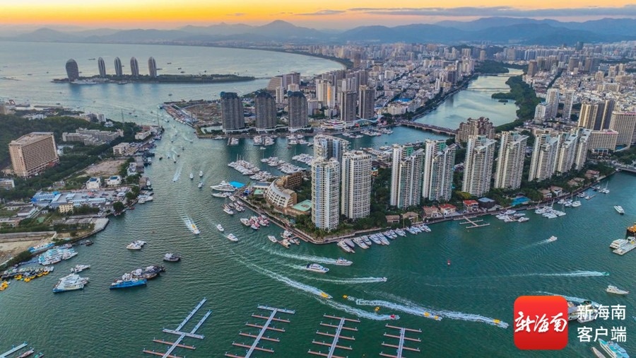 在三亚河出海口,出海体验游的游艇如万箭齐发,陆续归港。海南日报 张茂 摄