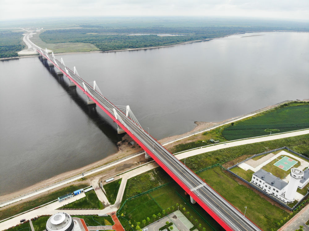 这是2023年8月11日在中国黑河一侧拍摄的黑河-布拉戈维申斯克公路桥(无人机照片)。新华社记者 王松 摄