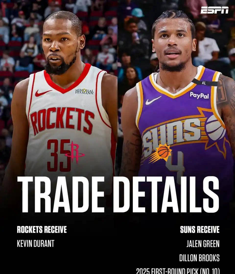 尽管多家美媒当时一致看好火箭单方面获益,认为杜兰特加盟极大提升他们的阵地战和一对一能力,使得火箭即使缺少控卫范乔丹,依旧站稳西部前五的位置,具备了强烈的冠军竞争力。但事实同样证明太阳也拿到了真正价值。虽然ESPN最初给予太阳队D级评价,但随着赛季进行,迪龙·布鲁克斯打出了职业生涯最佳数据,场均21.5分、3.1个篮板、1.6次助攻与1.3次抢断,三分命中率达到惊人的45.7%。他成为太阳扭转乾坤的关键人物。