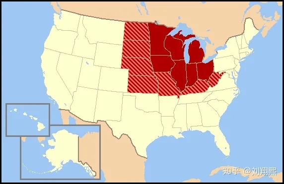 美国中西部(Midwest)通常指的是美国地理上中北部的州, 也是所谓的面包篮+铁锈带区域,包括俄亥俄州、印第安那州、密歇根州、伊利诺伊州、威斯康星州、爱荷华州、肯萨斯州、密苏里州、明尼苏达州、内布拉斯加州、北达科他州及南达科他州 的 12个州