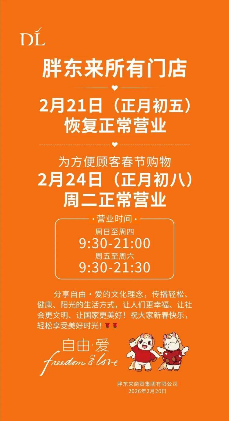 据“胖东来商贸集团”此前消息,为方便顾客春节购物,胖东来所有门店于2月21日(正月初五)恢复正常营业。2月24日(正月初八)周二正常营业,营业时间为:周日至周四9:30—21:00,周五至周六9:30—21:30。