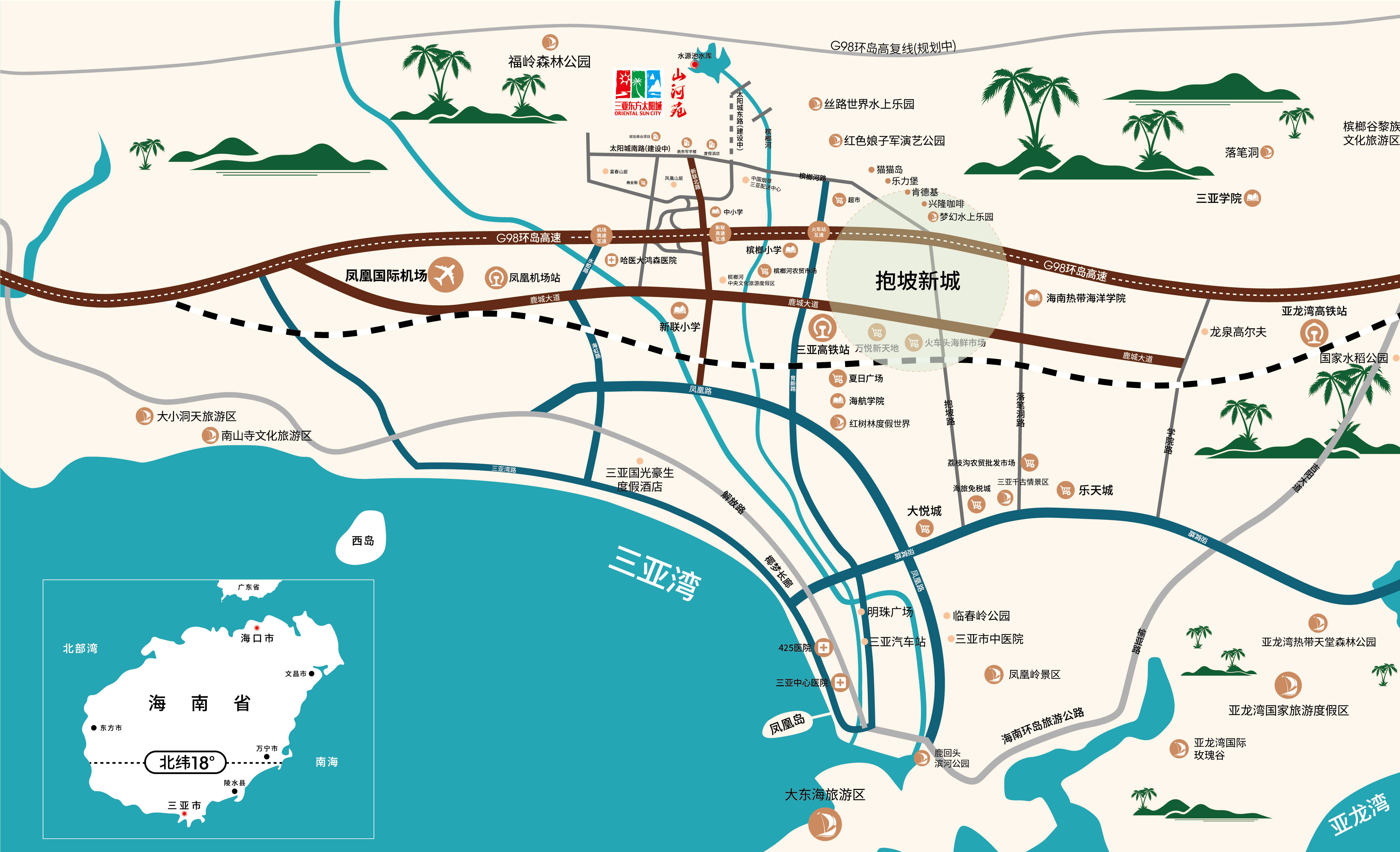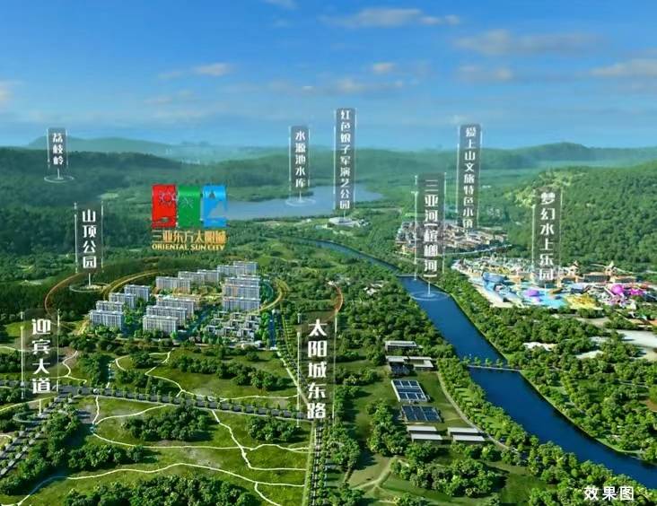 三亚东方太阳城·山河苑项目,西卧山顶公园,东拥三亚河(槟榔河),近享水源池水库、荔枝岭生态景观,面朝三亚主城区、三亚湾等,以山河为靠,以繁华为景,打造天赋上境栖居地。