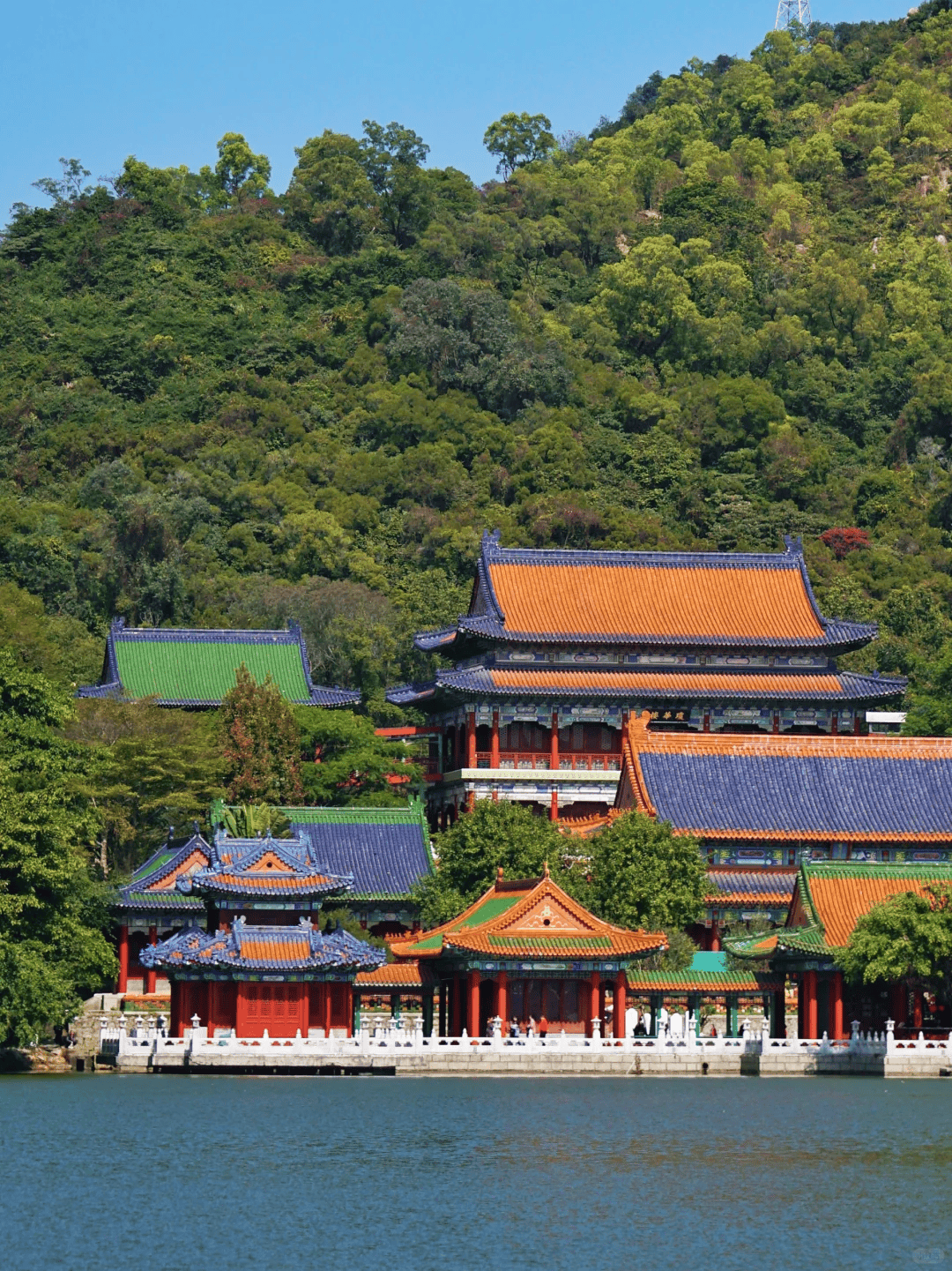 这里既有宫廷建筑的雍容华贵,又有江南水乡园林的隽秀,四方庭院彼此回廊相连,红墙绿瓦绿柱,飞檐翘角,三面环山,抱湖而坐,青山绿水,再现当年北京圆明园的宏大气势和万园之园的情景。