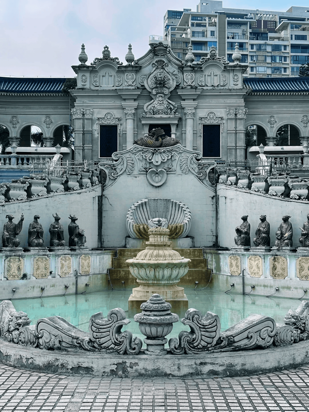 在珠海园区还仿建了原遗址中的西洋楼群和大水法,这里有巴洛克风格的建筑,白色的大理石墙身,精致的殿内装饰,还集合了十二生肖头像,偶尔还能见到舞动的喷泉,惟妙惟肖。