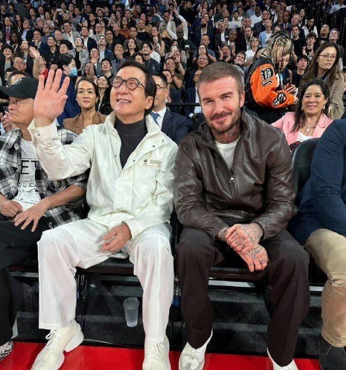 比赛未开始,贵宾席已先声夺人。 篮网与太阳队球员还在热身时,VIP区的互动已引爆全场。 贝克汉姆一入场便与成龙拥抱寒暄,两人聊得热火朝天。 由于成龙习惯用粤语交流,贝克汉姆偶尔面露困惑,一旁的马云迅速切换中英文帮忙传递内容。