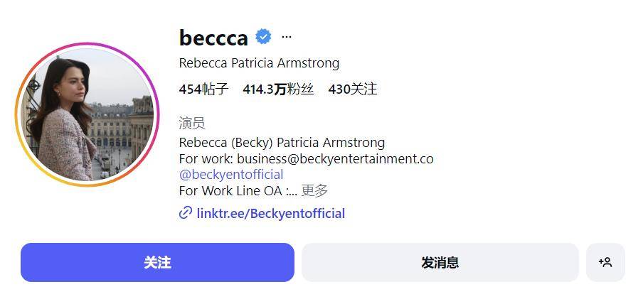 Becky的Ins账号拥有超过420万全球粉丝,其粉丝群体遍布60多个国家。