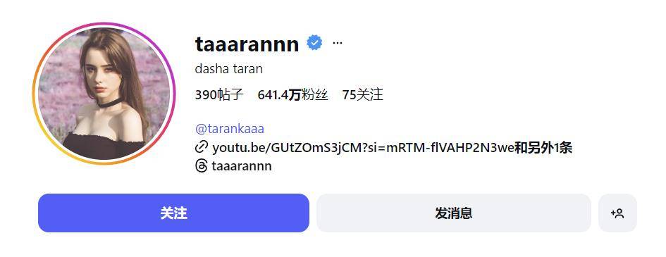 达莎在Ins上拥有超过640万粉丝,观看次数接近4000万次,全球粉丝量超过800万。